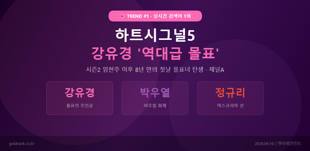 2026년 4월 14일, 채널A에서 첫 방송된 연애 리얼리티 프로그램 하트시그널 시즌5가 방송 직후부터 실시간 검색어 1위를 차지하며 뜨거운 화제를 모으고 있습니다. 특히 마지막 입주자 강유경이 등장과 동시에 남성 출연자 3인의 표를 싹쓸이하는 ‘역대급 몰표’를 기록하며 시청자들의 폭발적인 관심을 받았습니다.